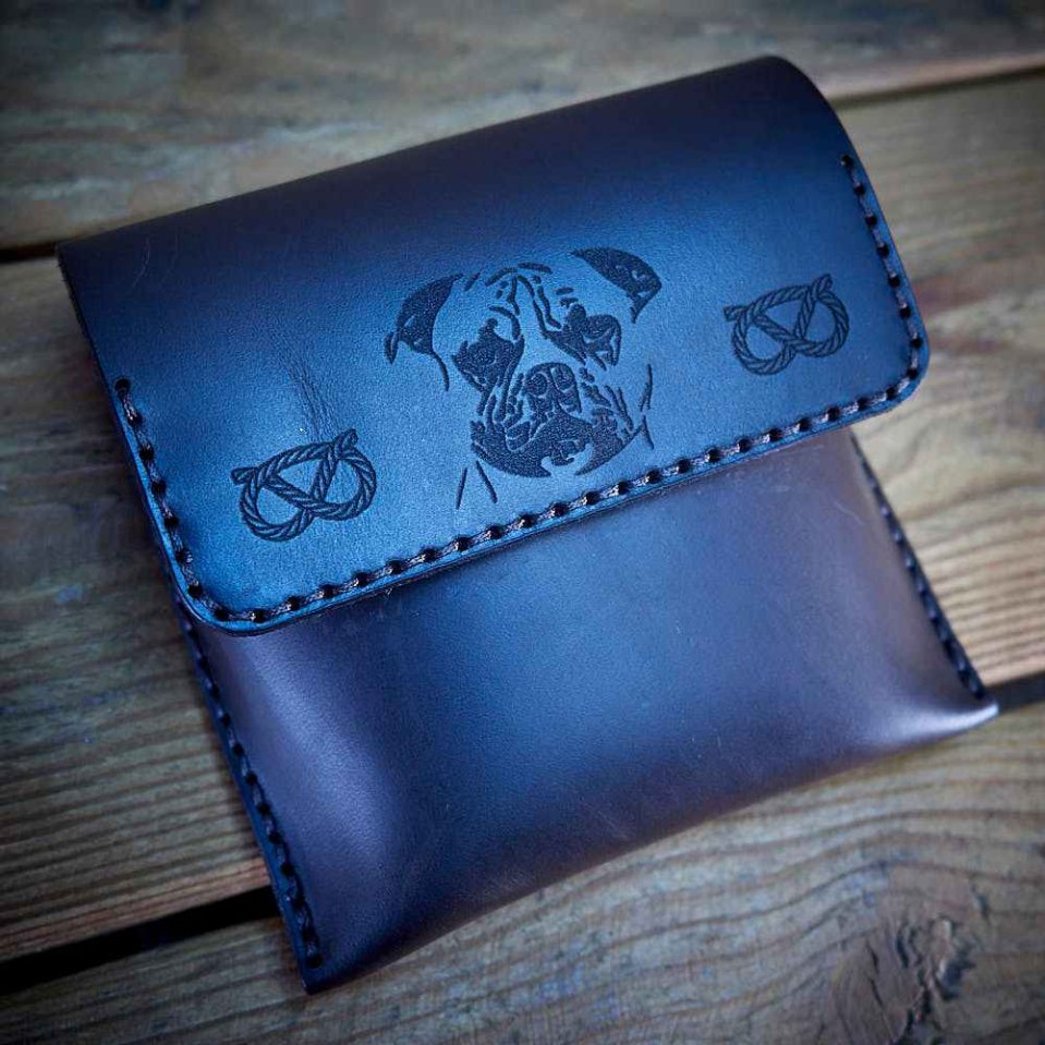 Le rabat est orné d’une gravure représentant une tête de Staffordshire Bull Terrier accompagnée de motifs de nœuds traditionnels. Une gravure personnalisée est également possible : nom du chien, nom d’élevage ou autre texte. La personnalisation renforce l’identité sans altérer la fonctionnalité.